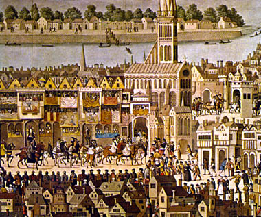 Along the route near the Tower “stood members of the craftsmen’s guilds, and, on the other side of the road, priests and clerks in holy orders” stood. Houses were decked out in tapestries and banners “as Richely as might be Devysed” (Loach 33).