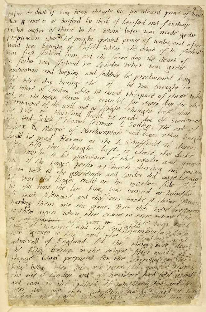 After the death of King Henry th’eight his son Edward prince of Wales was come to at Hartford by th’erle of Hartford and S[ir] Anthony Brown Master of t’horse for whom befor was made great preparation that he might be created Prince of Wales, and after ward was brought to Enfield whear the death of his Father was first shewed him, and the same day the death of his father was shewed in London, wher was great lamentation and weping and sodenly he proclaimed King. The next day, being the _ of _ he was brought to the Towre of London whear he taried the space of three wikes… (Edward VI).  Those three weeks were spent in preparation for Henry VII’s funeral and Edward’s coronation. 57197_764549