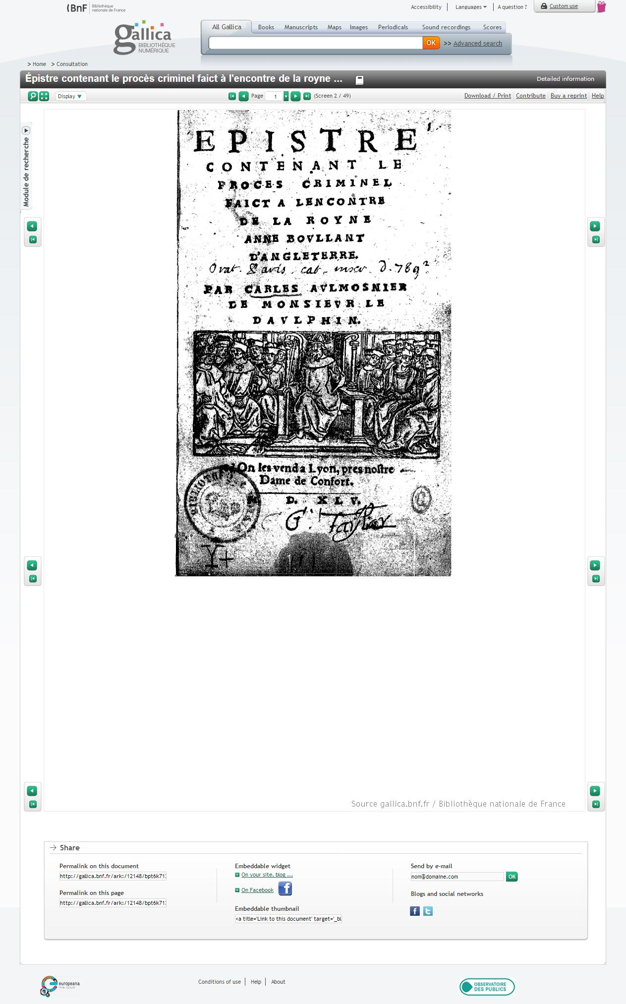 A poem, Epistre Contenant le Procès Criminel Faict a l’Encontre de la Royne Anne Boullant d’Angleterre (A Letter Containing the Criminal Charges Laid Against Queen Anne Boleyn of England), was summarized in dispatch papers 2 June 1536.  Referred to as a “poem descriptive of the life of Anne Boleyn, composed at London”, it was written by Lancelot de Carle (also spelled Carles) while serving as secretary to the French Ambassador in England, Antoine de Castelnau (Gairdner X 1036).