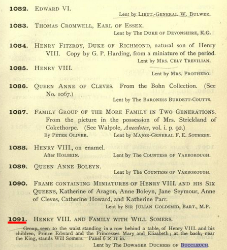 With The Madonna of the Yarnwinder safely returned, the next big event in the art collection of the Buccleuch estate was when Chris Lister, house manager at Boughton House, brought to the attention of Tracy Borman and Alison Weir “a never-before-exhibited picture” of Henry VIII and his family (“The Forgotten Portrait”). This blogger must dispute the claim that this painting has never been seen before. In fact, it was seen in The Tudor Exhibition at the New Gallery in 1890. Freeman O’Donoghue wrote a text, A Descriptive and Classified Catalogue of Portraits of Queen Elizabeth, in 1894, in which he gathered together information from “the catalogues of the exhibitions held from time to time in London, at which a large number of portraits of Queen Elizabeth have been shown” (O’Donoghue v). O’Donoghue offered special thanks to Sir George Scharf, Secretary and Director of the National Portrait Gallery for his help in assisting him [Freeman] by “generously allowing him unrestricted access to the sketches in which, during a long course of years, he has recorded all portraits of interest that came under his notice” (O’Donoghue v). O’Donoghue must also credit himself as he was thanked in the credits of the Exhibition of the Royal House of Tudor catalogue for his work. Therefore, it must be concluded that either Freeman or Sir George gained access to the Buccleuch collection and either informed the curators of the New Gallery or the painting was general known. Below is the exact entry from the Catalogue.